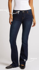 The Becca Mid Rise Bootcut Jean, designed to flatter every shape. Choose your style with or without flap pockets, available in multiple colors.
