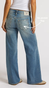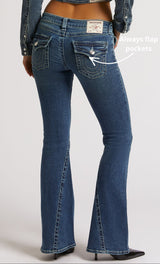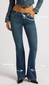 The Joey Low Rise Flare Jean, comes with our signature Pocket Flap and the Twisted Leg. Available in multiple washes.